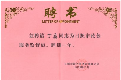 2020年12月3日,日照市政府服務(wù)管理辦公室、日照市行政審批服務(wù)局舉行日照市政務(wù)服務(wù)監(jiān)督員聘任儀式及政府開放日活動,公司董事、行政總監(jiān)丁磊被聘為日照市政務(wù)服務(wù)監(jiān)督員。